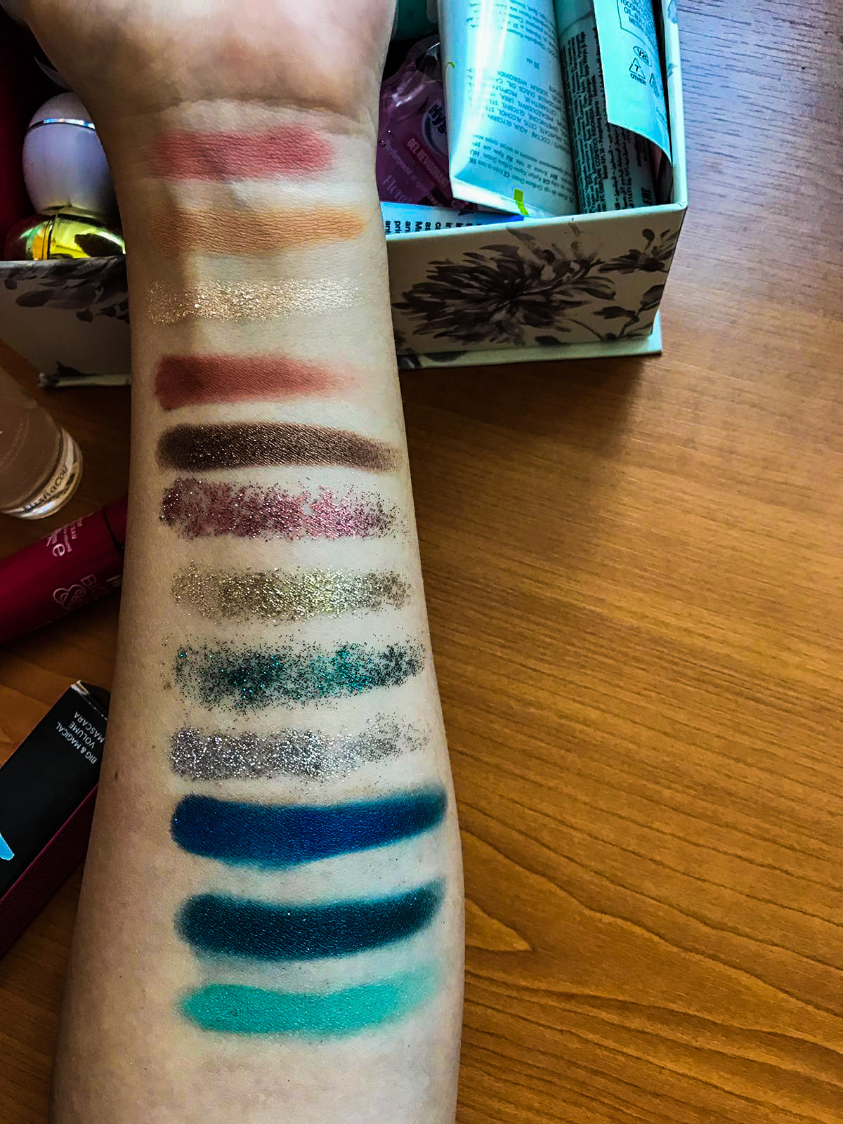 Mai jos o să vă las și un swatch pentru a observa cum arată, de fapt, culorile în contact cu pielea. Bineînțeles, fardurile top-coat sunt mai puțin pronunțate, pe când celelalte farduri de pleoape ies în evidență mult mai mult.